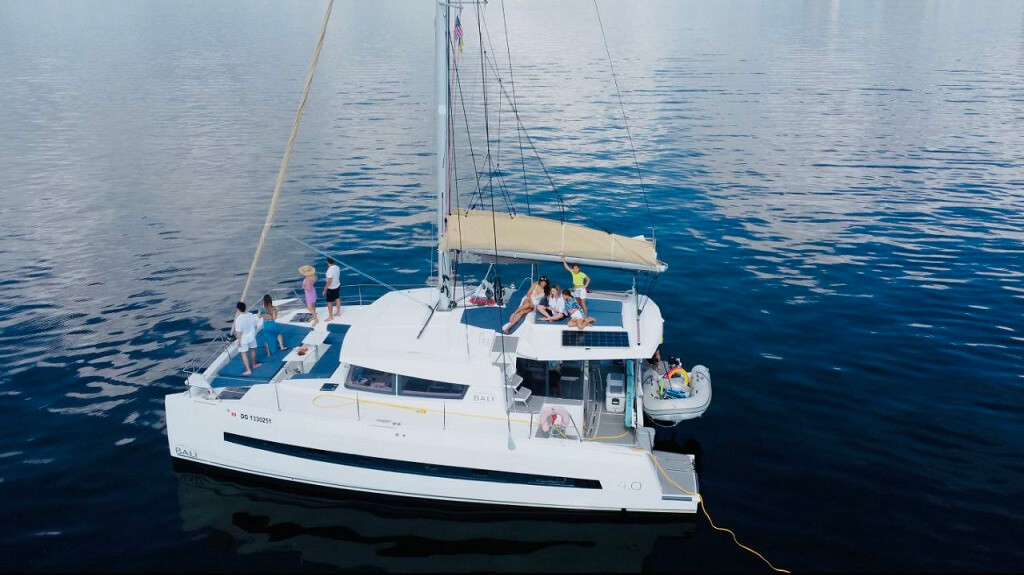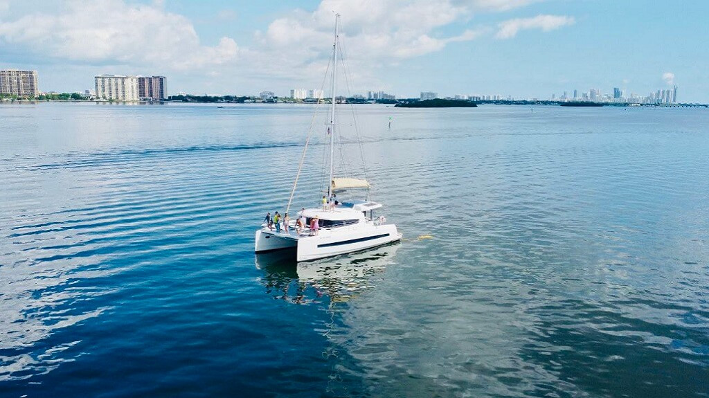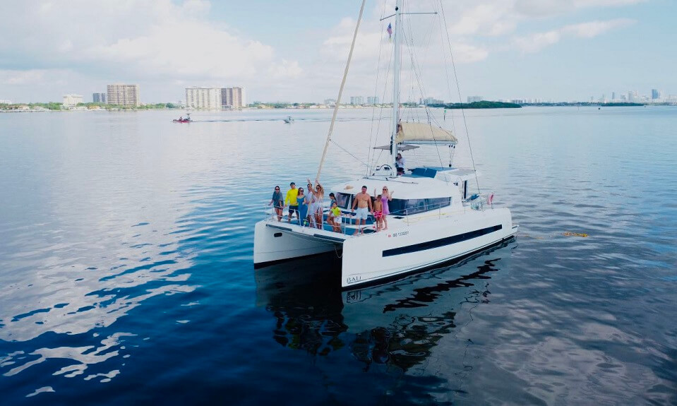 The 40ft Bali Catamaran is the perfect choice for half/full day charters in and around Miami. She is a top choice for those who want to enjoy an exciting day on the water with family & friends. The bow includes a deck net area, bow seats & twin tables, peripheral seats & table, and safety handrails (perfect for children). Picturesque views can be enjoyed from the flybridge area. The flybridge also provides twin sunbeds for guests who wish to soak up the sun! The shaded rear deck area is a great spot to relax with a cool beverage in hand. This area also has a swim ladder for guest comfort.